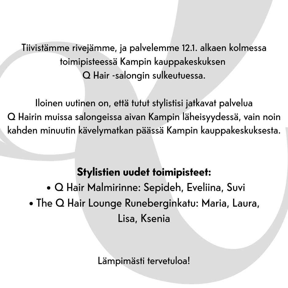 Q Hair on kampaamoalan edelläkävijä Helsingin keskustassa. Tarjoamme asiakkaillemme laadukasta, sekä luotettavaa palvelua vakaalla ammattitaidolla kaikissa neljässä salongissamme.
